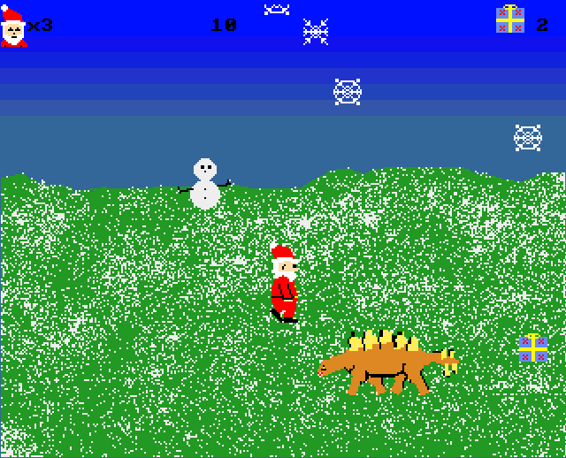 Father Christmas Vs Dinosaurs is an Amiga game created in 2018 by E-Penguin who wanted to code a game in Blitz2 for his son who requested a game with dinosaurs. Help Father Christmas capture them in gift boxes! Music by Michael / Nuance.